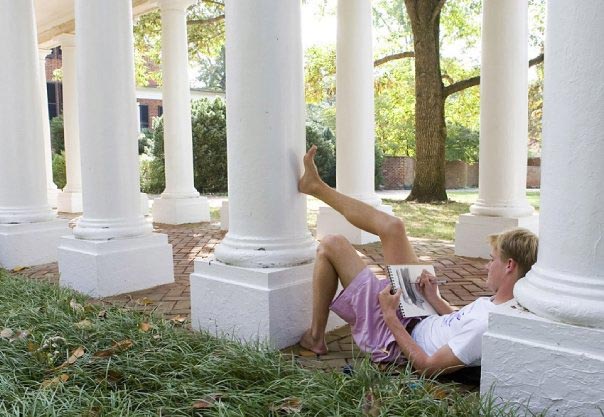 John McCarey (Col class of ’88) Languishing under a tree on the Lawn, eyes closed, to listen to the absence of the voices from the incoming fall students, panicking in a rush to get their books.