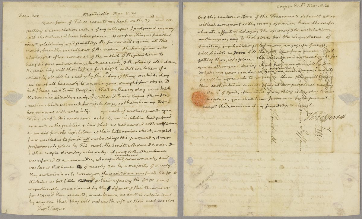 In this March 1820 letter from Thomas Jefferson to Dr. Thomas Cooper, Jefferson writes about the progress of the construction of the Academical Village. He tells Cooper, who was the first professor appointed to teach at the University of Virginia, that his “pavilion is finished except plaistering and painting.”