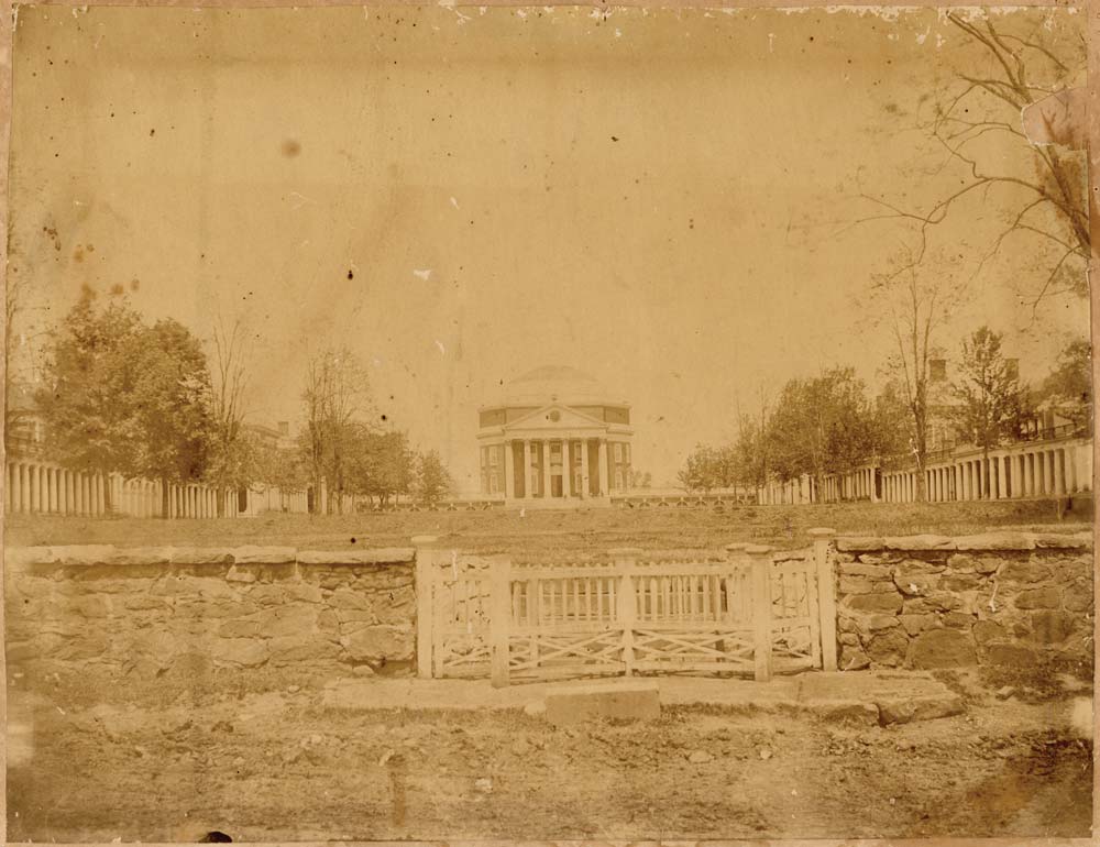 Taken shortly after the Civil War, this is the earliest known photograph of the Lawn and Rotunda. The gate in the foreground is described on a Special Collections Web site as a “cow-catch that prevented livestock from grazing on the Lawn—unless a groundskeeper decided that it needed trimming.” While the open south end of the Lawn provided easy access for hungry cattle, it was a source of consternation for many at the University. In Thomas Jefferson’s Academical Village, UVA architecture professor Richard Guy Wilson writes that the Lawn’s “openness” created for some “a seeming emptiness and lack of termination. Many individuals, including architects and faculty, appear to have felt threatened by it, and they proposed huts for statues of Jefferson, buildings, triumphal arches, and chapels, all intended either to fill up or close off that yawning space.”