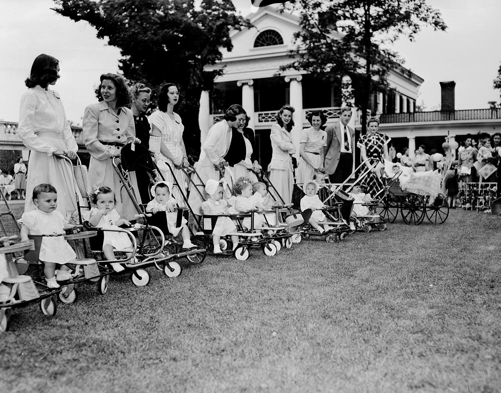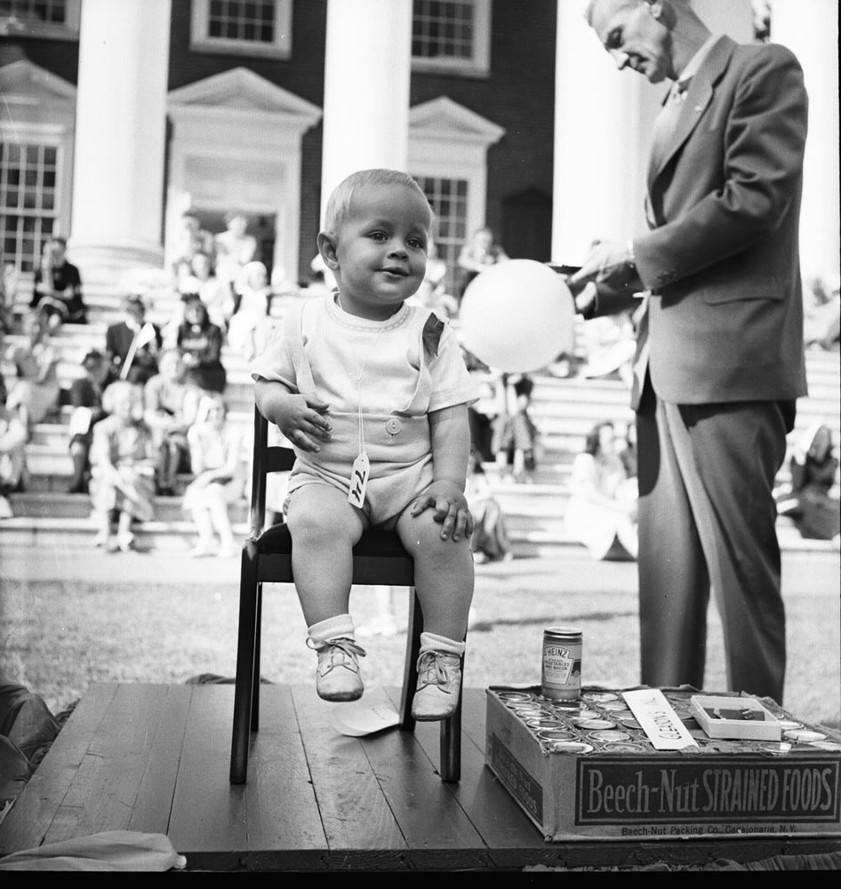 During these post-war years, the Cavalier Ladies, an organization of wives of UVA students, held a variety of annual fund-raising events, including a fashion show and a baby show on the Lawn. According to the Albemarle Charlottesville Historical Society, the second annual baby show in 1948 featured nearly 600 babies, who were paraded before a panel of judges headed by UVA President and Mrs. Colgate Darden. Prizes were awarded and proceeds from the show were donated to the Rucker Home for Convalescent Children.