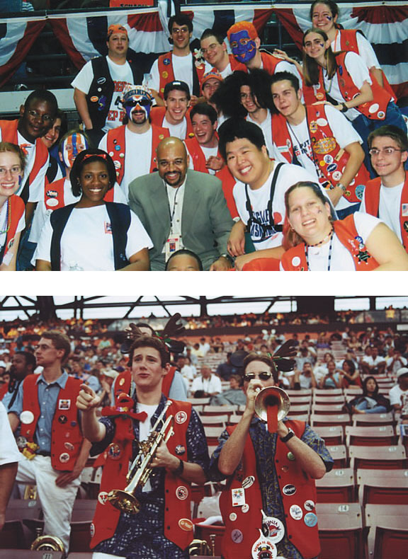 Top: The band with ESPN’s Michael Wilbon at the 2002 ACC Men’s Basketball Tournament. Wilbon’s wife, Sheryl, is a 1988 graduate.