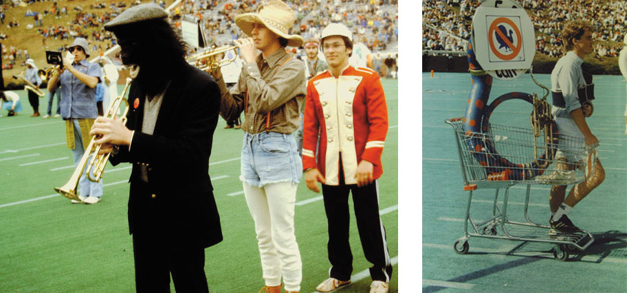 The band had always taken its satire, if little else, seriously. That was the code among “scramble” bands, which were the antipode to regimented marching bands. Scramble bands didn’t march. They sprinted into formations—giant turkey feet, Mickey Mouse ears, even a marijuana joint, to name a few that the Virginia band mustered into in its early years—as a PA announcer cracked jokes and musicians blared rollicking noise. Smart—and smart-alecky—students played in them. They were studiedly ragtag, bent on bending the rules.