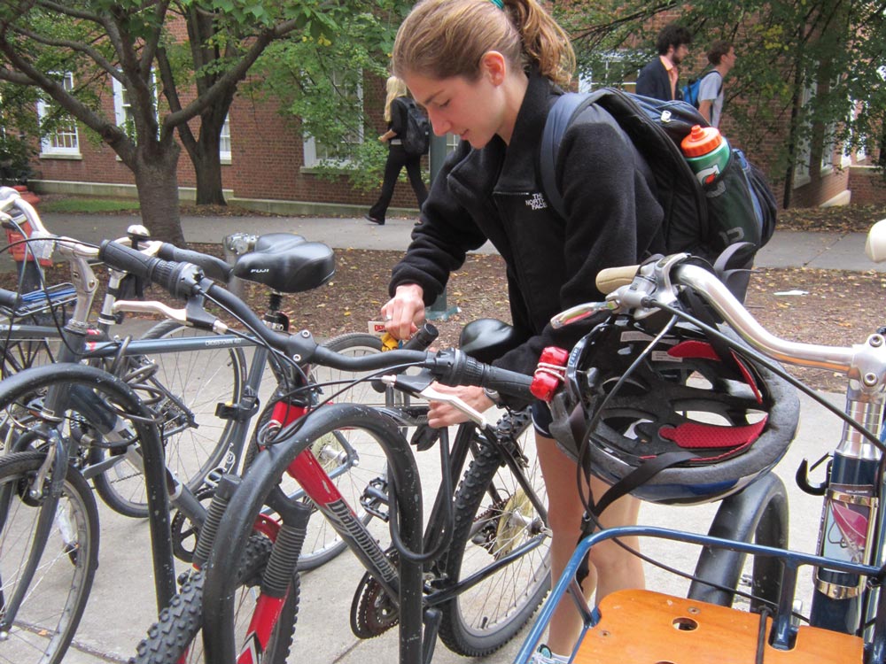 Corrigan relies on her bike to meet the demands of her schedule. She packs her gear—shoes, socks, books, Gatorade—hops on her bike, and pedals from one stop to the next.