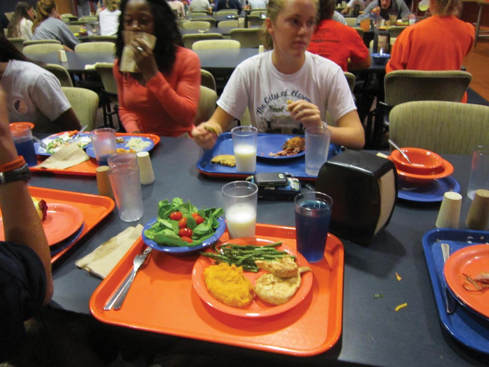 Corrigan sits down to dinner with friends and teammates in the athletics dining hall. On her tray: salad, asparagus, sweet potato, grilled chicken, milk and Gatorade.