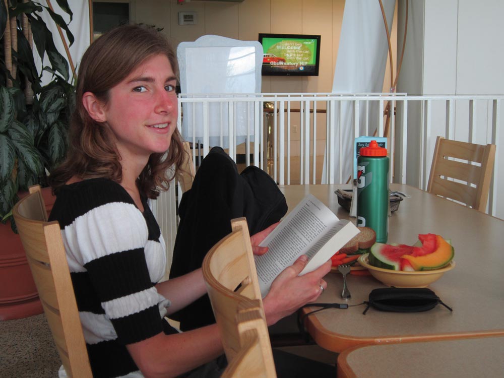 A systems engineering student, Corrigan has mastered the art of multitasking—digging into a textbook while eating her lunch.