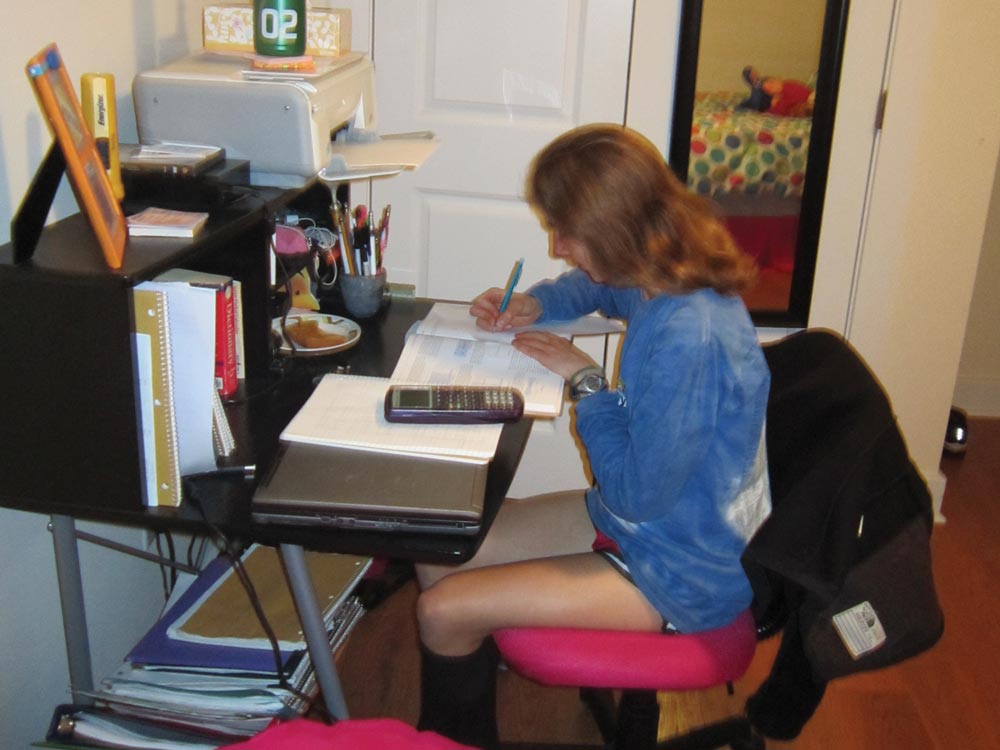 At 8 p.m., Corrigan dons compression socks (they help with blood flow and muscle recovery after lengthy runs) and wades knee-deep into homework.