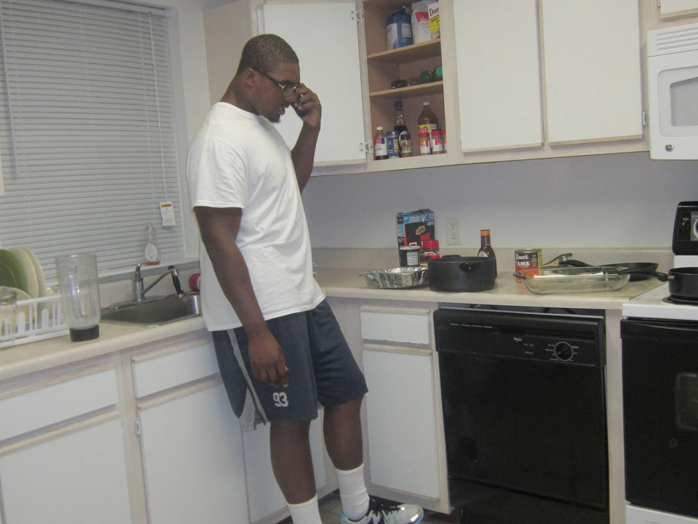 Hill prepares a dinner of spaghetti, sweet potatoes and corn for himself and his housemates. He prefers cooking at home to eating elsewhere. “Sometimes we don’t have enough, though—we’re all on the team and, well, we eat a lot.”