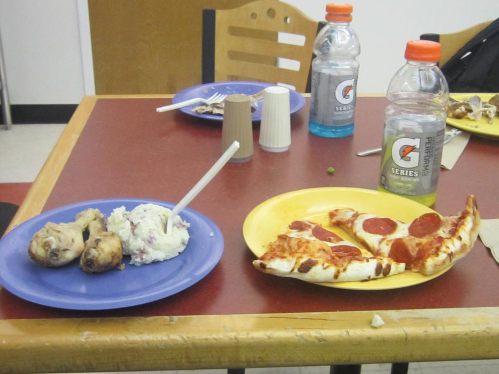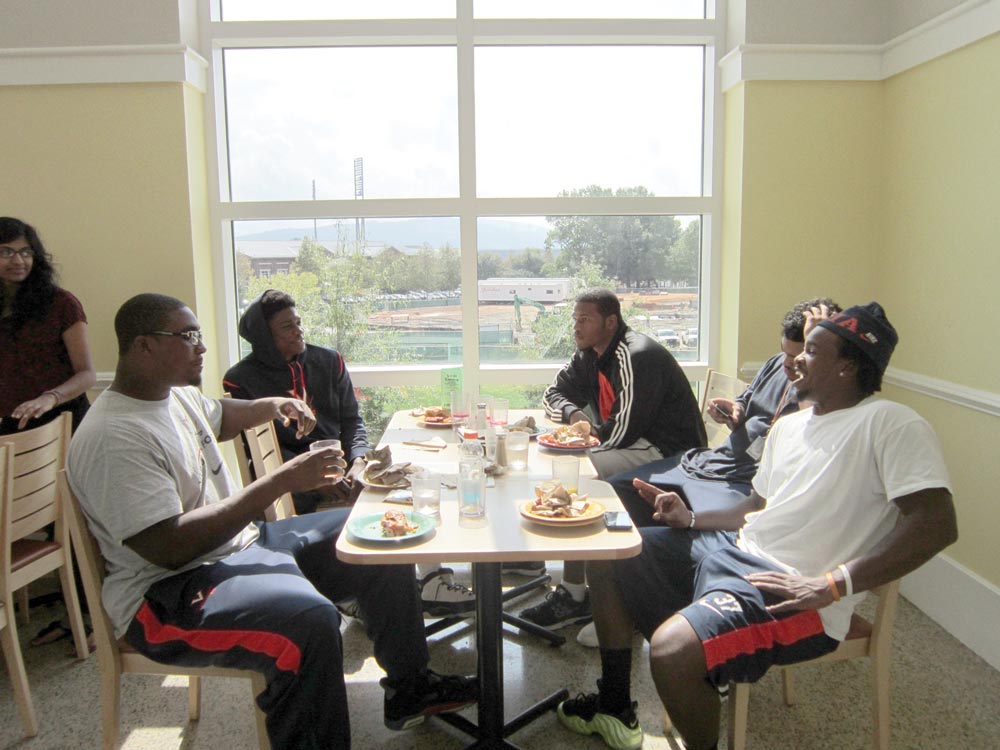 After practice, Hill heads to O-Hill dining hall to chow down with teammates before class. A typical lunch: two or three slices of pizza, a chicken sandwich and fries, Gatorade and water.