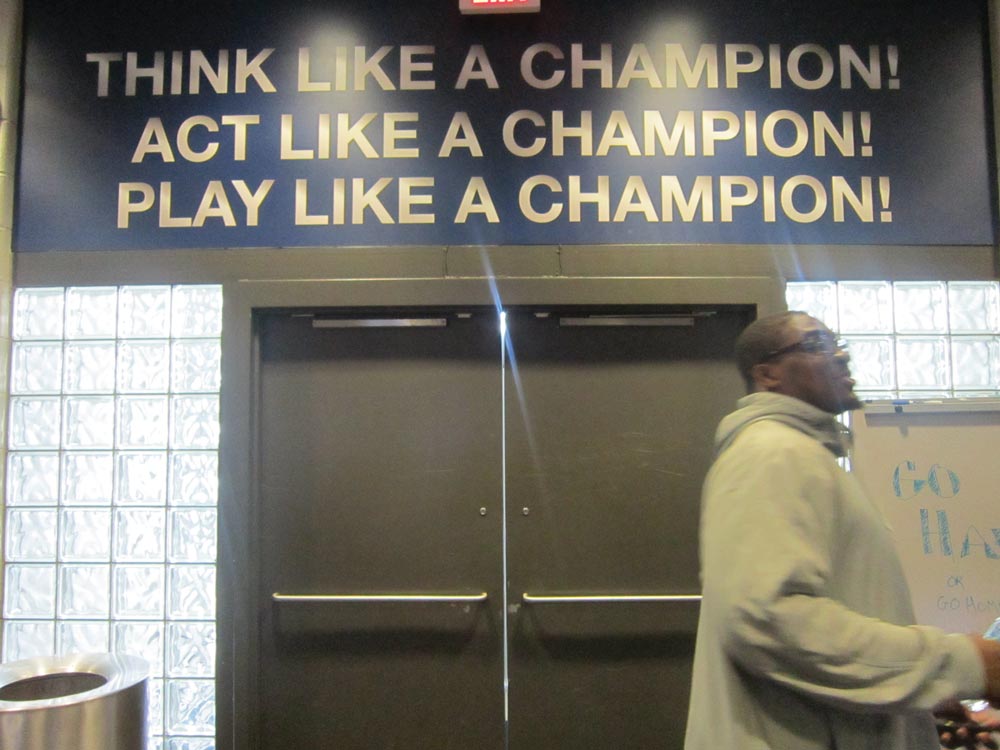 Team meetings begin at 6:25 a.m. on the dot and last for an hour and a half; practice begins at 8. The locker room sign, says Hill, “speaks volumes of the character of our team.”