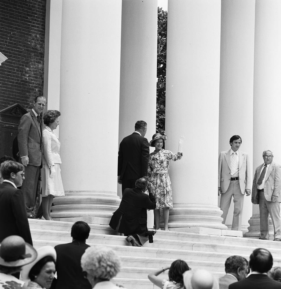 In 1976, Queen Elizabeth II visited several cities in the United States to commemorate the nation’s bicentennial. On July 10, she toured Monticello and the Academical Village, where an estimated 18,000 people watched her stroll down the Lawn. Virginia Gov. Mills E. Godwin hosted a luncheon for the queen in the Dome Room of the Rotunda. A potentially uncomfortable moment for the queen was averted by professor Ray Bice and Alexander “Sandy” Gilliam Jr. (Col class of ’55), former secretary to the Rector and Visitors, and current University history and protocol officer. Before the event, Gilliam, who chaired the planning committee, walked the queen’s route at the same time of day she would. As he reached the top of the stairs to the Dome Room, he discovered “the sun would hit the queen right in her eyes and she wouldn’t be able to see anything,” said Gilliam.
