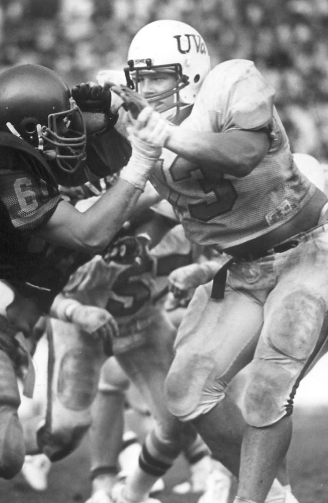His football skills benefited from his background in hockey, says former UVA coach Dick Bestwick. “He was a goalie in hockey. That’s a knee-bending position, and playing offensive line is about being able to bend your knees and move your feet. So that probably helped him.”