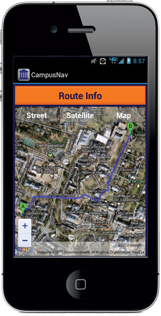Nizri launched the app for Android users in early September; to date, it’s had over 550 downloads. A student enters his start and end points and the app gives walking instructions. The difference between this app and other GPS apps, Nizri says, is that Grounds Nav “has all the specific locations on Grounds—buildings, fraternities, athletic fields—stored, so you can click on a place and it shows you where it is on a map and gives you step-by-step walking directions.”