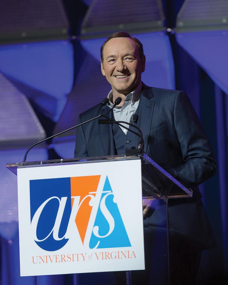 “Don’t be afraid to shake things up. No one ever breaks new ground by playing it safe,” actor Kevin Spacey advised an audience of more than 9,000 on Oct. 18 at John Paul Jones arena. Spacey, a two-time Academy Award winner, was this year’s President’s Speaker for the Arts at UVA. He sprinkled his speech with UVA references, at one point even high-fiving Allen Groves (Law class of ’90), dean of students. When discussing the role of ambition in the arts world, Spacey quoted Frank Underwood, the power-loving, manipulative character he plays in the Netflix series House of Cards. But he also emphasized the importance of generosity among artists, quoting his mentor, Jack Lemmon. “If you’ve been successful in your chosen path, then you should help those who are just starting out,” he said. “Jack coined the phrase ‘sending the elevator back down.’”