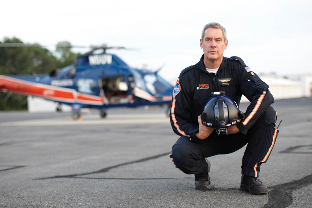 Pegasus has been transporting patients to UVA Hospital since 1984, but Welliver has been flying Pegasus only since 2004. He first spent 25 years as a helicopter pilot in the U.S. Army, and the skills that made him a good soldier have translated to his work in emergency medical services. “It’s important to be cool under pressure, fulfill the purpose of the mission and not be distracted from it,” he says. “My job is to fly safely and if I get caught up in the human drama, I won’t perform as well.”