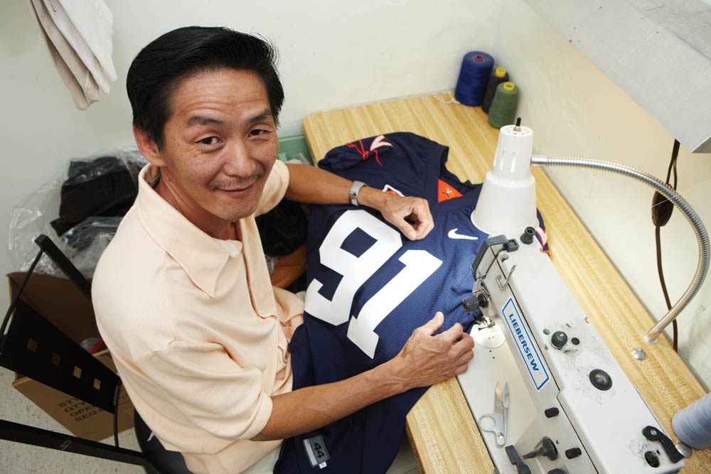 The football jerseys hang among the altered formal wear, wedding attire, military uniforms and suit jackets that constitute Bui’s other business. He’s also the tailor for the UVA baseball and basketball teams, and estimates that sports uniforms account for 10 percent of his workload. “Often the teams need rush jobs,” he says. “Drop off at night. Pick up in the morning for away games.”