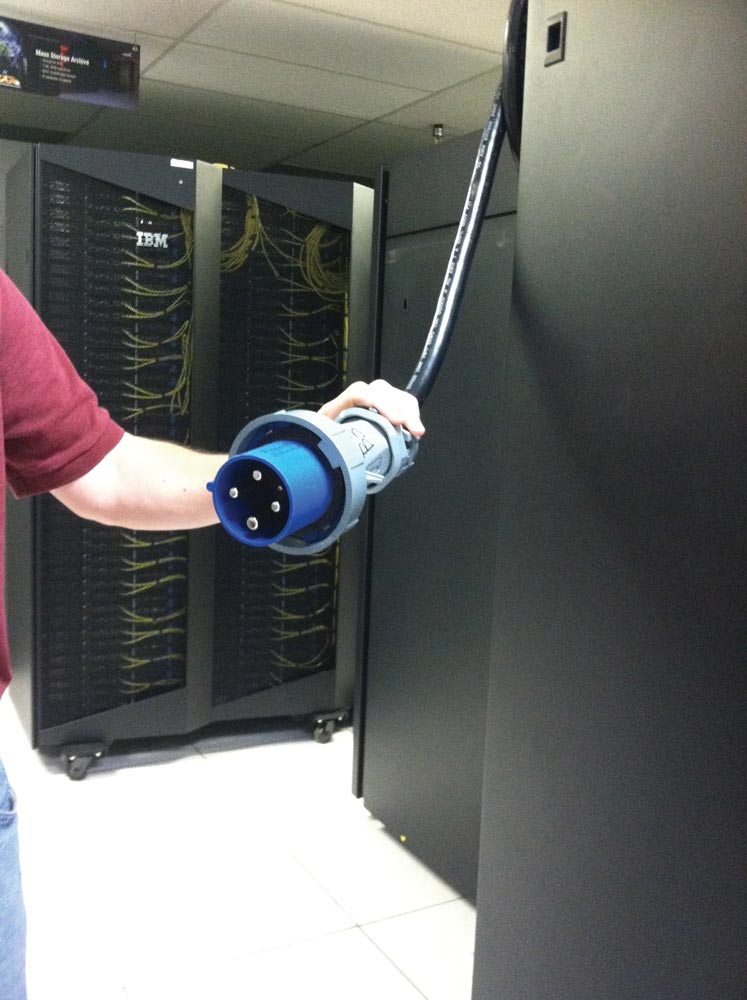 Dozens of shelves held stacks upon stacks of blinking computers, all interconnected with various multicolored wiring. Walking down an aisle felt like entering the control room of a spaceship. One of my tour guides showed me the comically large electrical plug used to power just one rack of computers.