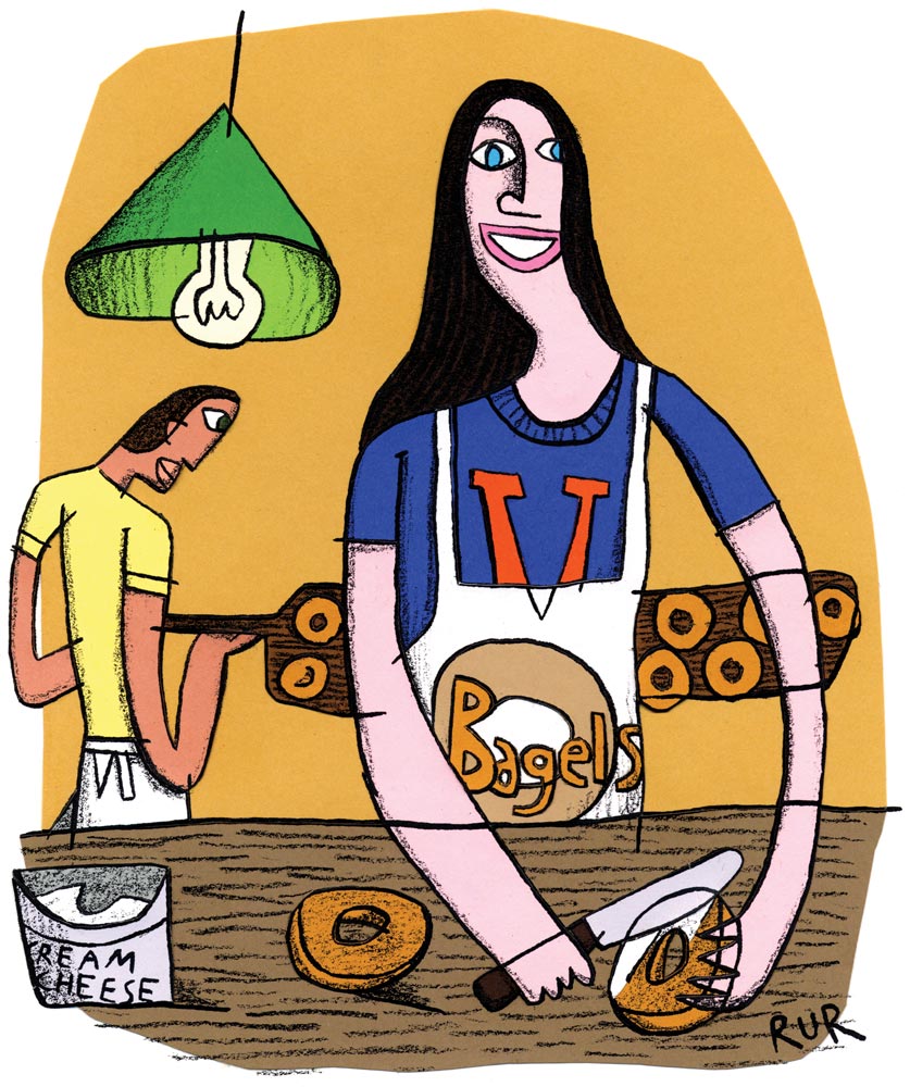 One Sunday morning in early May, employees at Bodo’s on the Corner were deftly spreading cream cheese on bagels and calling ticket numbers of students waiting in a line winding to the door. But later that month, on a rainy Thursday afternoon, the line had disappeared and employees were cleaning counters or creating a Bodo’s logo from bagels. “It’s pretty dead when the students aren’t around,” says Cameron Kendrick (Nurs class of ’12), “but it’s still fun to come to work.”