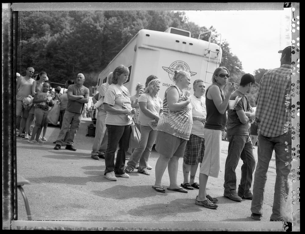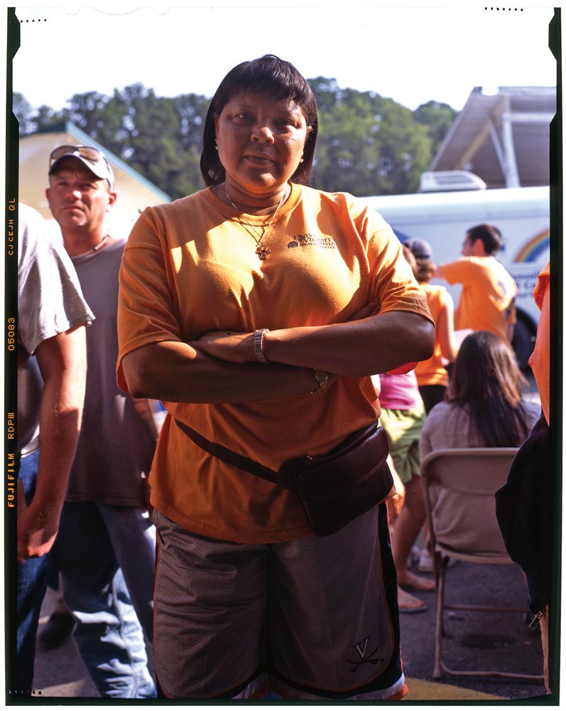 During a high school scuffle in 2002, Brandon Stivers was hit in the back of the head with a lock. “I got 10 stitches, but it didn’t seem like a big deal,” he says. After a car accident last year, the injury has started to hurt again. “It aches. Especially if I move my head to the left.” This is Stivers’ second year at RAM, and he’s here to see an eye doctor and a neurologist about the head pain. During the year, he goes to the emergency room when he needs health care. “They send you letters if you can’t pay, but that’s all.” Stivers and his girlfriend, Misty Serra, got a ride to the fairgrounds from Serra’s mother and are sleeping in a tent. “Last night, the Army guys who are doing the security helped us out by making a plastic cover for our tent. It’s kinda hectic out there. The ground’s hard and it’s difficult to sleep.” Stivers used to work for Pepsi-Cola at a loading dock.