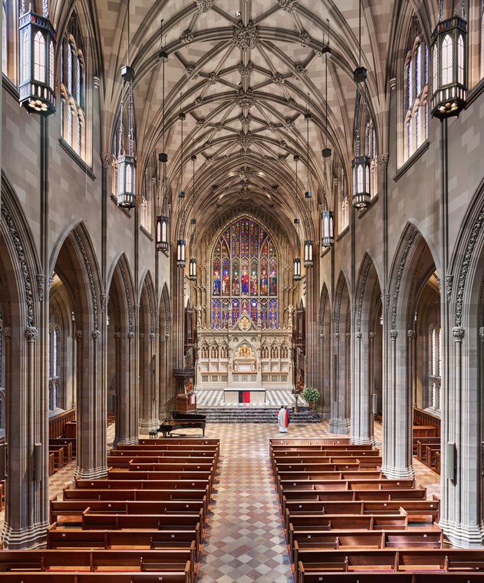 The result, which was mostly complete by 2022, is a more welcoming building for churchgoers with better lighting and pews and accessible features. Murphy and his team also made the church more sustainable, reestablishing the insulation and exterior glazing on the stained glass to reduce its energy use. And, like a puzzle, they found ways to add back in the modern-day necessities without obscuring the architecture.