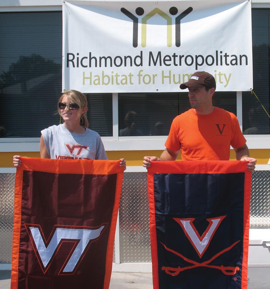 The Hokies vs. ’Hoos Habitat Challenge, as the effort is called, evolved from a common desire to help low-income people with housing. “There are so many different ways we could have gone about it. We just went with what we thought was the best route,” says Matt Shaver (Col class of ’02), the UVA club’s philanthropy chair.
