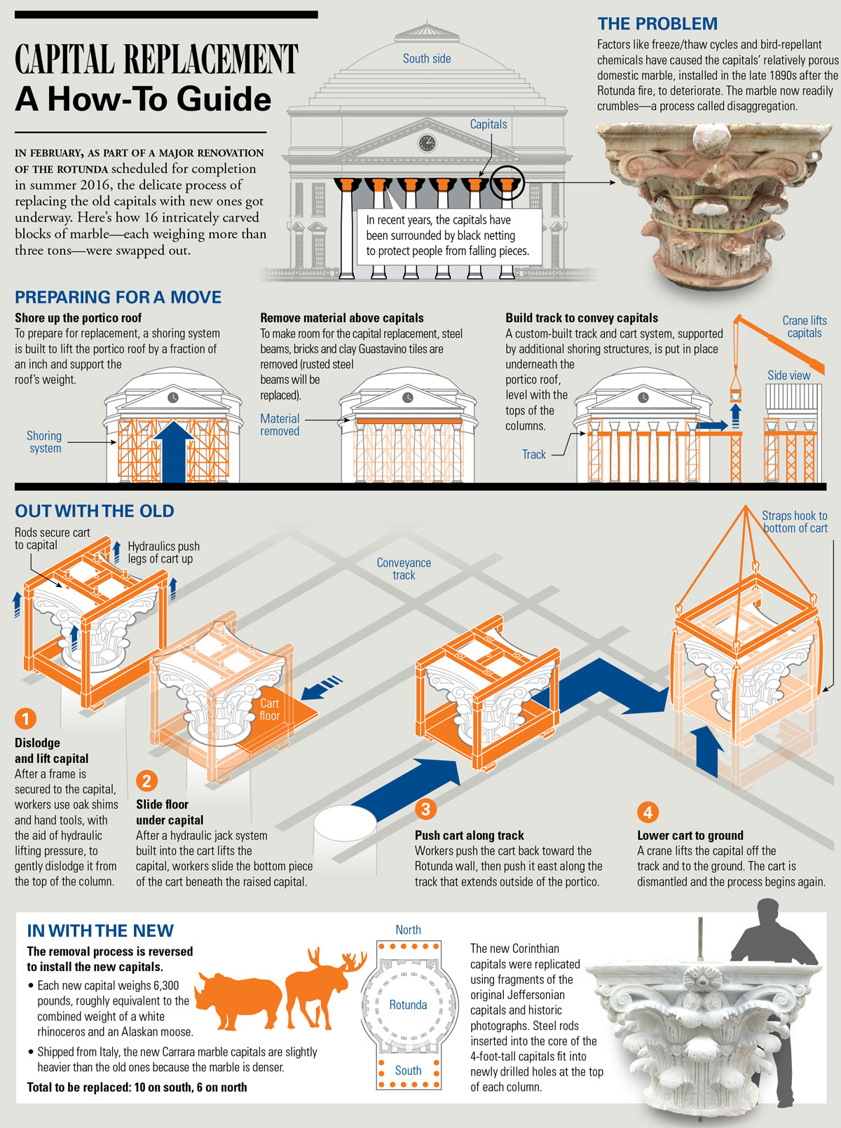 In February, as part of a major renovation of the Rotunda scheduled for completion in summer 2016, the delicate process of replacing the old capitals with new ones got underway. Here’s how 16 intricately carved blocks of marble—each weighing more than three tons—were swapped out.
