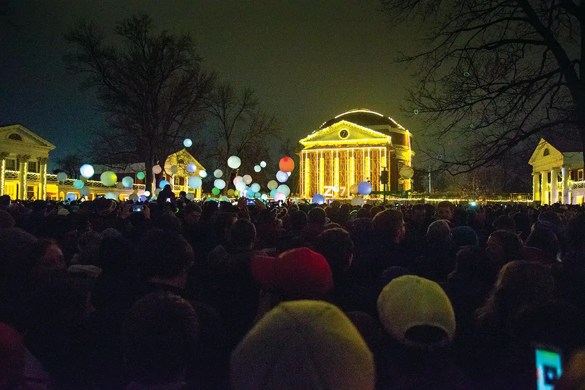 To kick off the holiday season and take a respite from the stress of fall-semester finals, throngs of students join community members for the Lighting of the Lawn, enjoying hot chocolate, a cappella performances, a dazzling light show against the night sky and the recitation of a poem recapping the past year. The annual event culminates in the illumination of thousands of bulbs dotting the Rotunda and the perimeter of the Lawn.