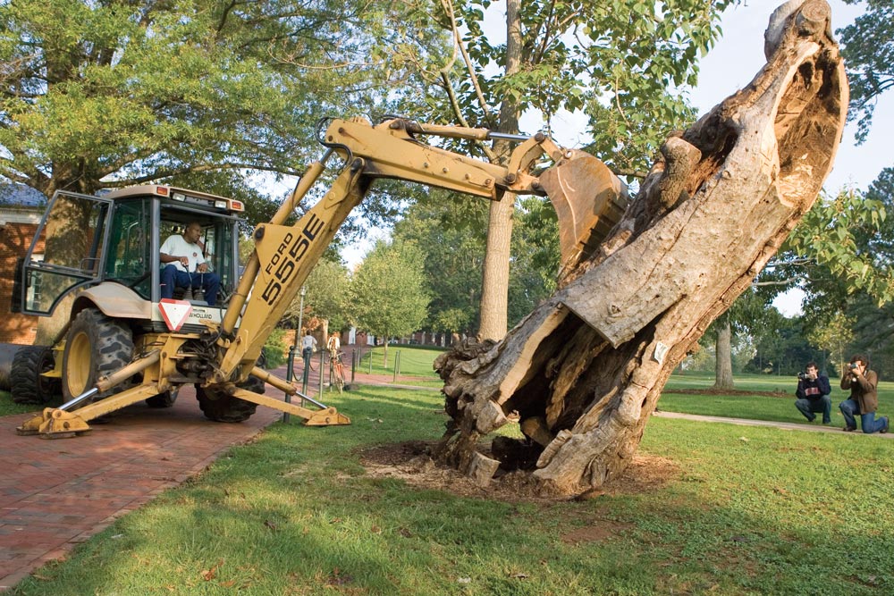 Though the fate of the East Range tree isn’t quite so romantic, its wood will find new life as sculpture. Studio art professor William H. Bennett and his students rose early on the morning of Sept. 6 to claim pieces of the long-dead tree, whose leaning, hollow trunk was deemed hazardous.