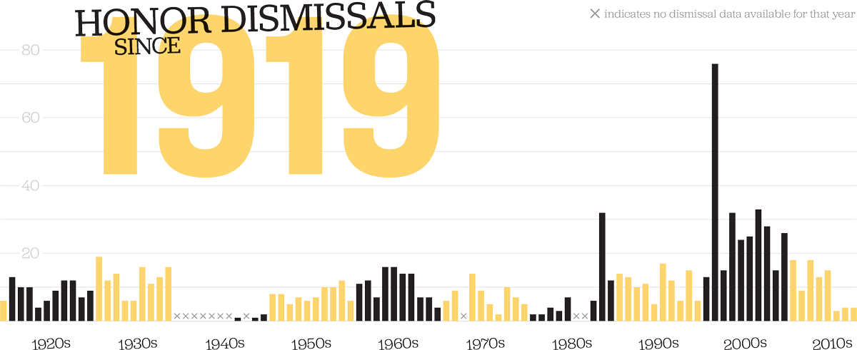 It’s tempting to blame the repeal 40 years ago of the provision that made it an offense to witness an Honor crime and not report it. In combing through all the historical data, however, the team found no instance of the so-called “non-toleration clause” ever having been enforced.