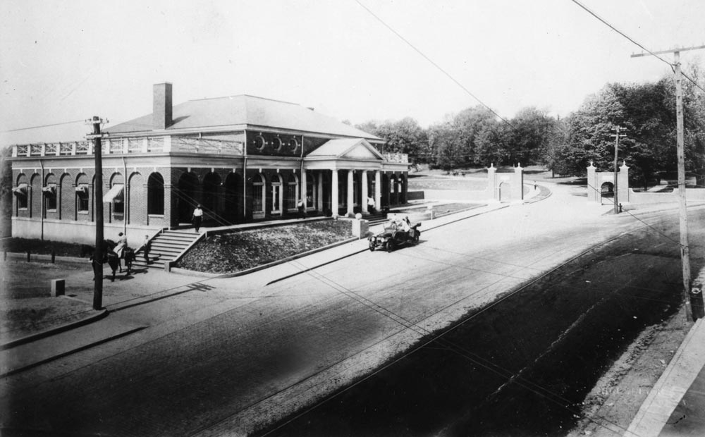 1913—The University’s new “Entrance Building,” erected behind Temperance Hall (which was razed a few months later) was unveiled and heralded the era of a “New Corner” during which older buildings were replaced with new ones. The deluxe Entrance Building (now known as the UVA Corner Building) had five separate storefronts. Mrs. Charles Senff donated money for a formal gateway in honor of her husband and in commemoration of the University’s Honor Code. Henry Bacon, architect of the Lincoln Memorial, used Harvard University’s 1901 gates as a model. Unlike the crude turnstile that had once marked the entrance to the Grounds, the Senff Gateway was designed to accommodate both pedestrians and automobiles. It was erected precisely where Temperance Hall had once stood. In 1927 the Entrance Building was shifted eastward closer to the railroad tracks to make way for construction of the new medical school.