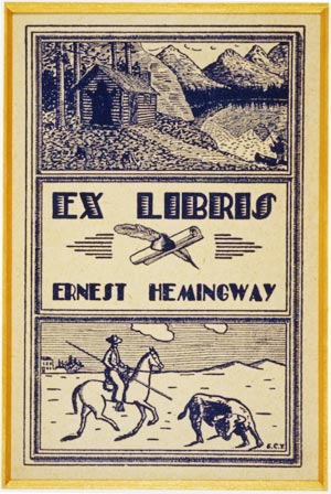 Ernest Hemingway’s depicts two scenes related to his writings: At the top is a log cabin in the mountains and a canoeist on a lake; at the bottom, a matador with a bull.