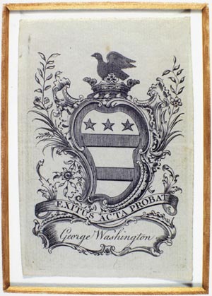 George Washington’s bookplate simply shows his family seal, with a bird perched on top and the motto “Exitus acta probat”—“the end shows the deed.”