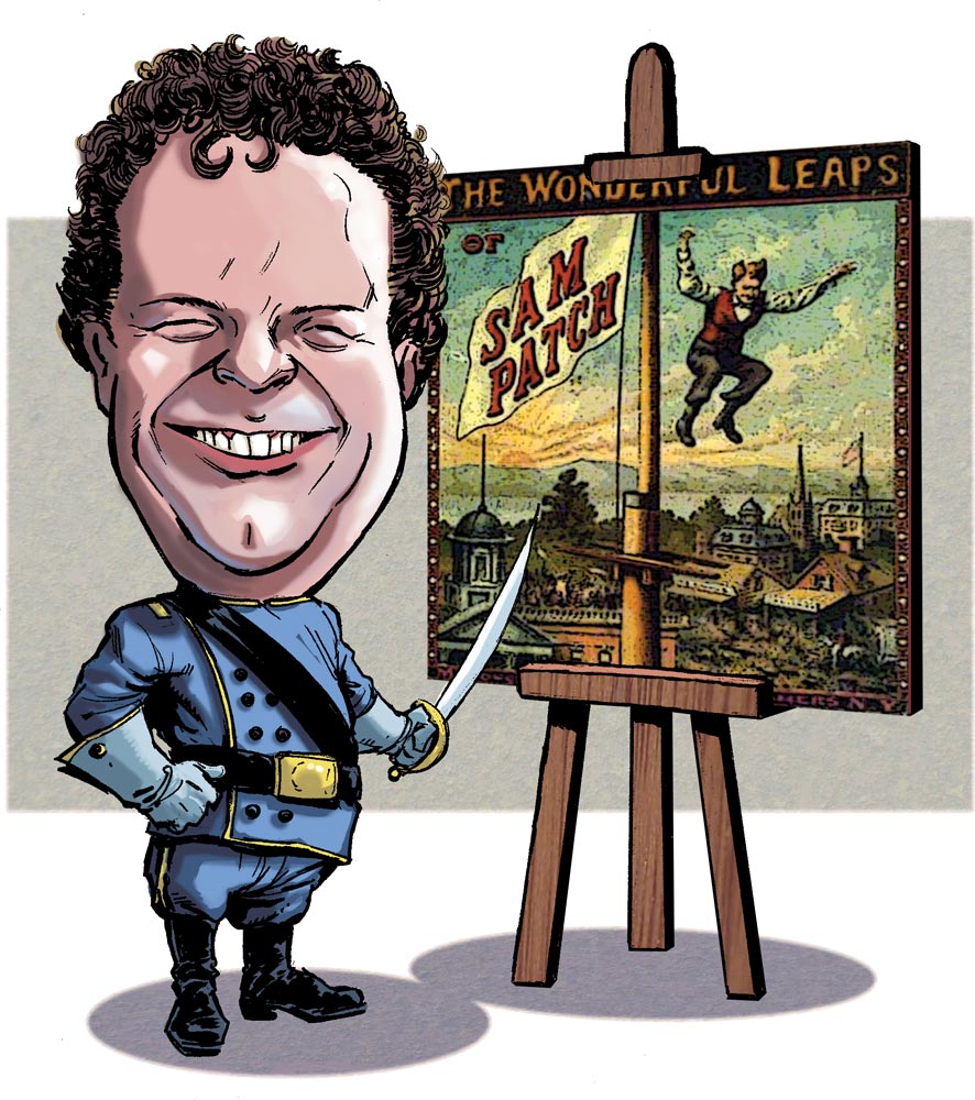 Take, for example, a cotton mill worker named Sam Patch (1807-29). Sam was a poor kid with no remarkable talents other than his penchant for jumping off bridges and mill dams and ships’ masts and, with one notable exception, surviving. In the news-hungry 19th century, he was propelled to national fame. In 1829, he bowed to a crowd of 10,000, kissed the American flag and jumped 120 feet into Niagara Falls.Newspapers all over the country started calling him “The Yankee Leaper” and “The New Jersey Jumper.” It’s hard to exaggerate how much press this man got; He was a true spectacle. If Patch was scheduled to jump in a particular town, it was covered in handbills and ads; Newspapers were calling his stunts the greatest feats of their kind ever attempted by man. Sadly, he plummeted to his death attempting his second jump into the Genesee River when he was just 22 years old. Before that fateful jump, he’d compared himself to Napoleon and had decided that he, Patch, was more courageous. Rumor has it somebody put a wooden board over his grave that said: “Sam Patch—Such is Fame.”