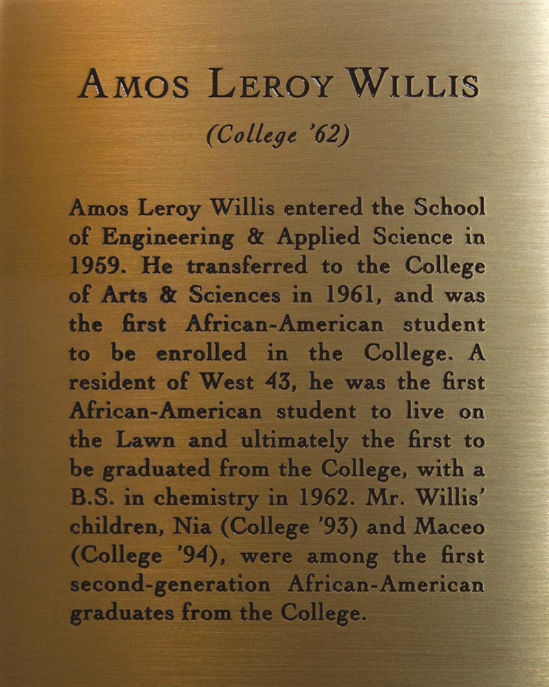 When Amos Leroy “Roy” Willis petitioned the College of Arts & Sciences to accept him as a student in 1959, he cited Thomas Jefferson’s “all men are created equal” passage from the Declaration of Independence. The administration eventually granted him permission to matriculate, and Willis (Col class of ’62) became the first African-American student to enroll in, and graduate from, the College of Arts & Sciences. Willis’ first few years at the University proved successful, and he was selected to live on the Lawn from 1961 to 1962, years during which selection was based solely on academic achievement.