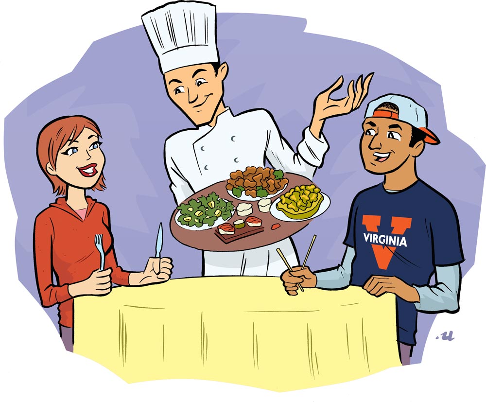 These foods represent just a sampling of the variety of fresh, seasonal items available in the three dining halls at UVA—Observatory Hill, Newcomb and Runk Hall. Choices that might not have been available a generation ago—sushi or stir-fry, for example—are standard fare now. “The stir-fry tastes like actual food, not plain cafeteria food,” says Anne Sun (Col class of ’13).