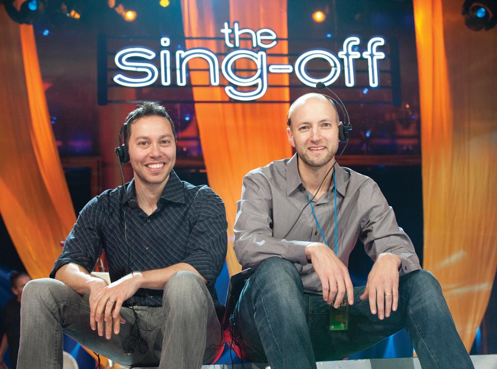 More than a decade ago, Rob Blatt (Col ‘96) and Sam Riegel (Col ‘99) were two undergraduate jokesters singing in the all-male a cappella group Academical Village People, hoping to get a few phone numbers or maybe even a date. These days, they’re rubbing elbows with pop star Nick Lachey as writers on the a cappella competition show The Sing-Off, which Lachey hosts. Blatt and Riegel call what they’re doing their “dream job.” “We are the perfect writers for this show,” Riegel says. “The other writers [on the show’s writing team] come to it with other backgrounds, but we come to it with a cappella experience.”