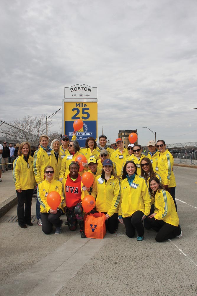 Jones, who moved to Boston in 2012, says she found her home in the city through the UVA Club. “I met Thuy at the very first event, I attended. She took me under her wing.” But it was her first time volunteering at Mile 25 in 2012 that cemented things for her. “Helping the runners with all these people that had a connection to UVA, I remember almost crying because it was so moving,” she says. “It just felt like I was at home.”