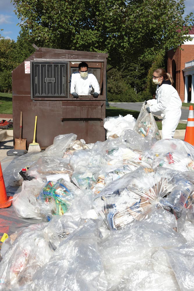 At the Darden School of Business, students got down and dirty in their first “trash audit,” or Dumpster Dive, on Oct. 2. They climbed into a bin, removed garbage, then sorted the recyclable material by categories. About half the waste proved to be recyclable.