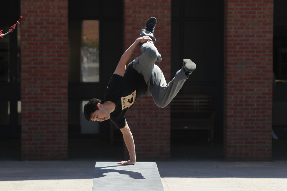 Second-year student Tyler Lam stares at the 8 feet that separate the handrail he’s standing on and the 6-foot brick wall in front of him near Hereford college.