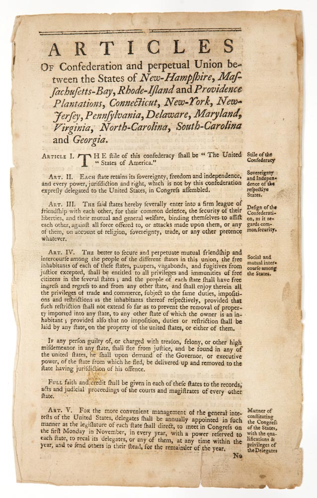 In June 1776 the Continental Congress appointed a committee to draft a constitution uniting all 13 states in one confederation. After protracted debate, Congress approved the Articles of Confederation on November 15, 1777 at Lancaster, Pa., where it fled after the British occupied Philadelphia. Probably the work of John Dunlap, first printer of the Declaration of Independence, this is one of the 200 official copies distributed to the states. The Articles remained in force until the Constitution took effect in 1789.