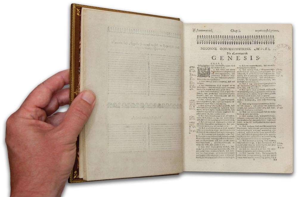 Puritan missionary John Eliot dedicated his life to converting New England’s Indians and translated the Bible into the language of the Massachusett tribe. Printed by Samuel Green and Marmaduke Johnson at the newly established Indian College adjacent to Harvard, the Eliot Indian Bible was the first Bible printed in the Americas. The New Testament was completed first, in 1661, followed two years later by the Old Testament.