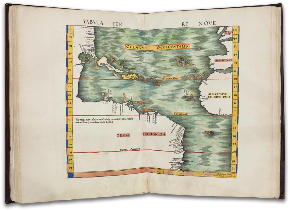 Often described as the earliest “modern” world atlas, Johann Schott’s 1513 edition was the first to include new maps based on contemporary Spanish and Portuguese explorations. In the hand-colored woodcut map shown here, the New World is not labeled “America,” but “Terra Incognita.” Europeans’ geographic knowledge of the Caribbean, Florida and northeast Brazil was expanding rapidly; this map was outdated on publication.