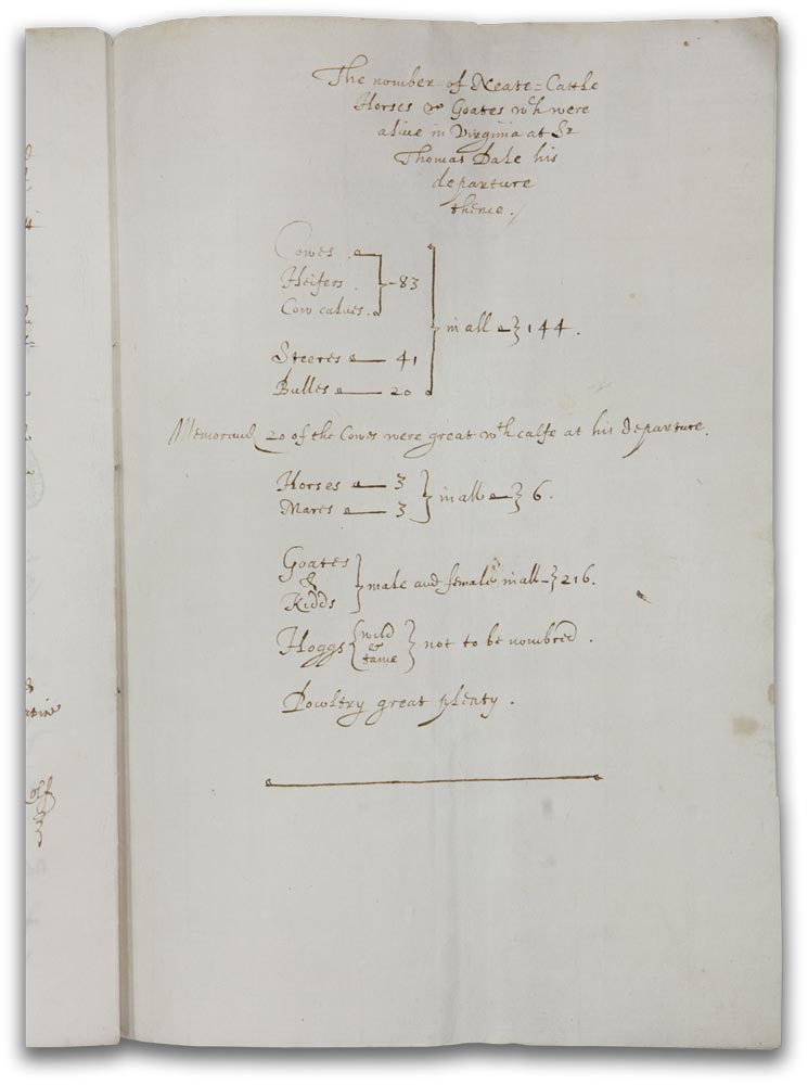 After coming to Virginia in 1610, John Rolfe established Virginia’s tobacco trade, married Pocahontas and served as colony secretary. This is one of three known copies of a report Rolfe circulated privately to spark interest in the struggling colony. He counted 351 colonists in six settlements and, on the page shown here, tallied their livestock. The manuscript is in a secretary’s hand, with Rolfe’s signature at the end.