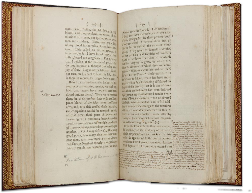 Thomas Jefferson wrote this work in 1781, bringing the manuscript with him to Paris the following year. There, he printed 200 copies for private distribution to friends and colleagues. Jefferson authorized the 1787 London edition, shown here, for public sale. This is Jefferson’s copy, which he annotated extensively in anticipation of a revised edition. All told, he added some 500 lines, plus 16 inserted manuscript pages and additional notes and corrections. Jefferson’s revisions were eventually incorporated into an edition published in Richmond in 1853.