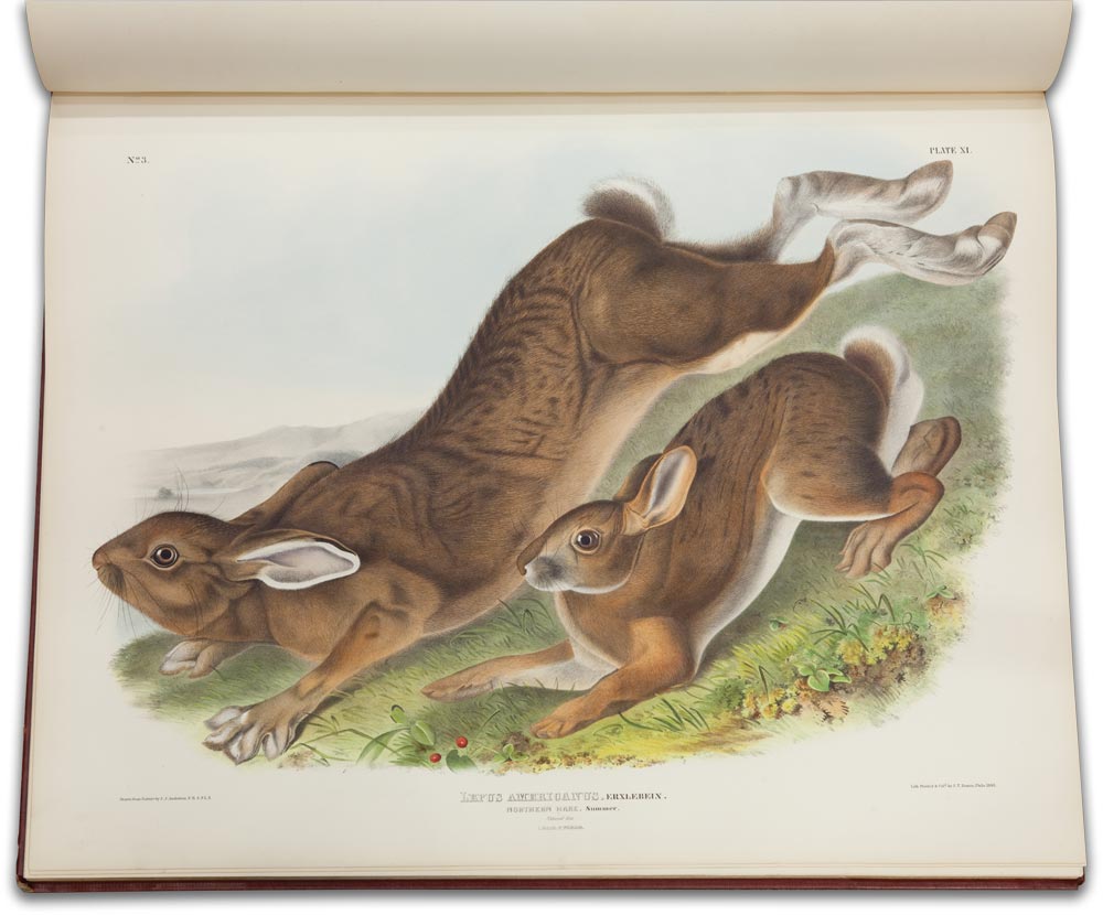 After completing The Birds of America in 1839, John James Audubon embarked on a new publication documenting the “viviparous quadrupeds,” or mammals, of North America. The completed work featured 150 elephant folio plates printed by lithography and hand colored after original drawings by Audubon and his son, John Woodhouse Audubon. Three text volumes, written largely by the Rev. John Bachman, accompanied the plate volumes.