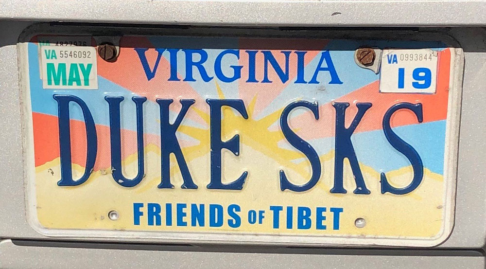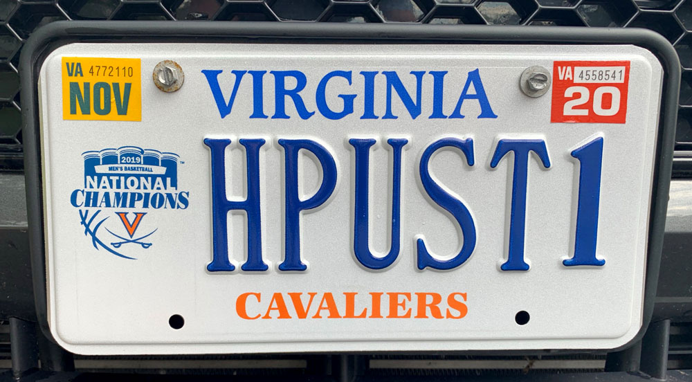 “The license plate has traveled to a lot of hostile territories like North Carolina, Maryland and Bleaksburg (spelling intentional). Fellow ‘Hoos on the way to away games or the ACC/NCAA Tournaments always give a supporting wave.” —Kyle Lewis (Col class of ’07, Com class of ’19)