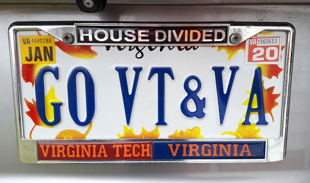 “This plate and I celebrated 25 years together in October 2018. I purchased it for my very first car while living deep in Va Tech territory. I have had only one nasty note left on my windshield because of it.” —Ashley Meloy Love (Col class of ’93)