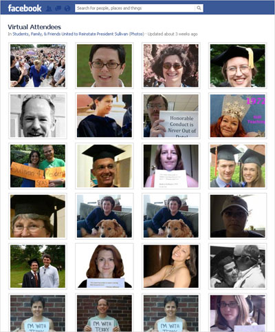 Suzie McCarthy, a graduate student pursuing a Ph.D. in politics, was one of the most active online organizers, and her Facebook group, “Students, Friends, & Family United for the Reinstatement of President Sullivan” grew to more than 6,000 members in a matter of days. The page currently has 16,408 members.