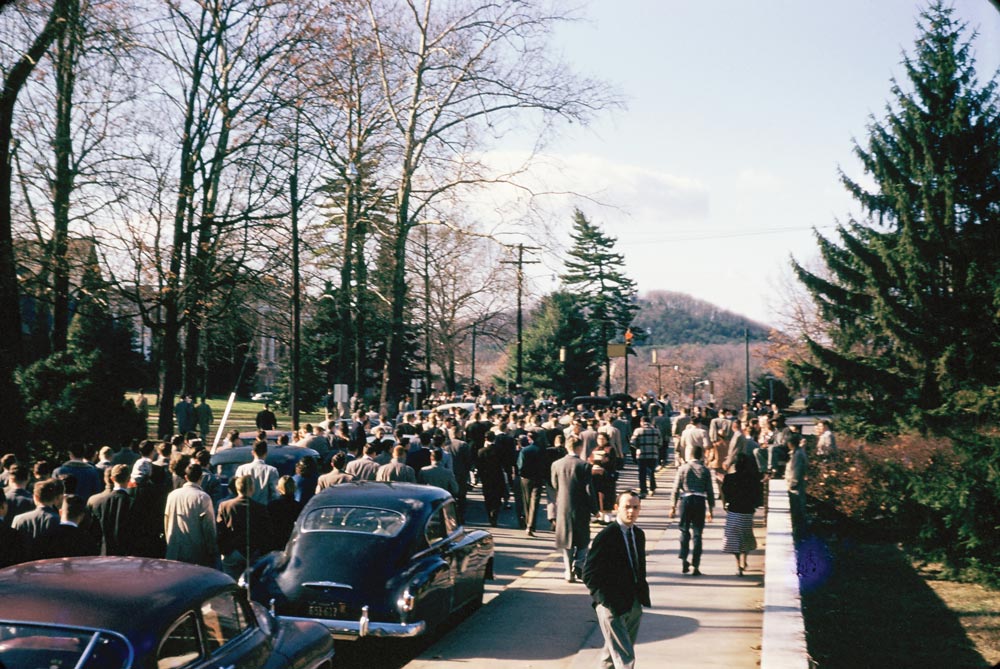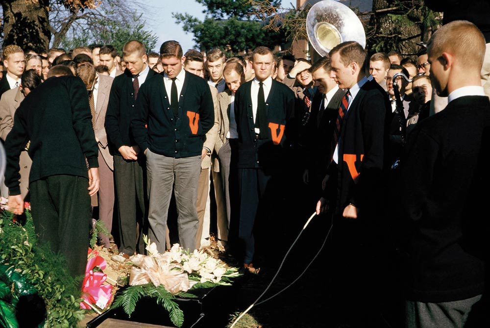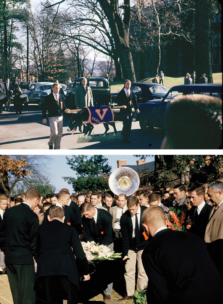 Seal became a kind of unofficial mascot of the football team from 1947 to 1953, and as such attended all the games in the care of the cheerleaders. His great moment of glory came in the fall of 1949 in Philadelphia, at our game with the University of Pennsylvania. It may seem hard to believe nowadays, but in 1949, Penn was a collegiate football powerhouse. At some point during the game, Seal wandered over to the Penn sidelines and inspected the megaphones, set on the ground, of the Penn cheerleaders. After a lot of snuffling around, he raised a leg and tilted on one of the megaphones—to the roar of the Virginia fans, of course. And wonder of wonders, UVA beat Penn.