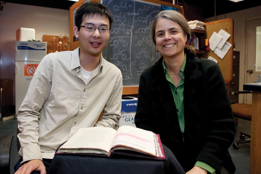 Guoqing Zhang (Grad class of ’10), a chemistry doctoral student at UVA, was experimenting with a sunscreen compound when he made a startling discovery. As he crushed crystals under an ultraviolet lamp, the green-blue-emitting material suddenly glowed yellow. When smeared on a surface, after a few minutes, the yellow regions reverted to green-blue.