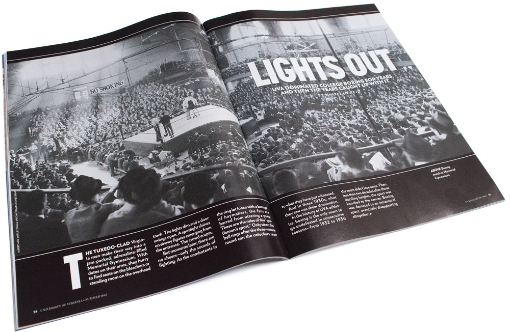 I recall certain nights in the winter during those years [1949–52] walking with my father [an engineering student on the G.I. Bill] down Copeley Hill to Memorial Gym to watch the boxing matches. The place was something out of a dream for a Venable Elementary School kid my age. The gym was dark, save for the brightly lit ring. I saw big guys hammering away at each other, sometimes falling, other times having their arms raised. I was transfixed. We usually watched from the heights of the running track, exactly where I watched the ’Hoos basketball teams when I came back as a first-year.